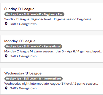 We have a variety of adult hockey leagues at Griff’s Georgetown, including men’s and women’s leagues, roller hockey leagues, co-ed and more.
